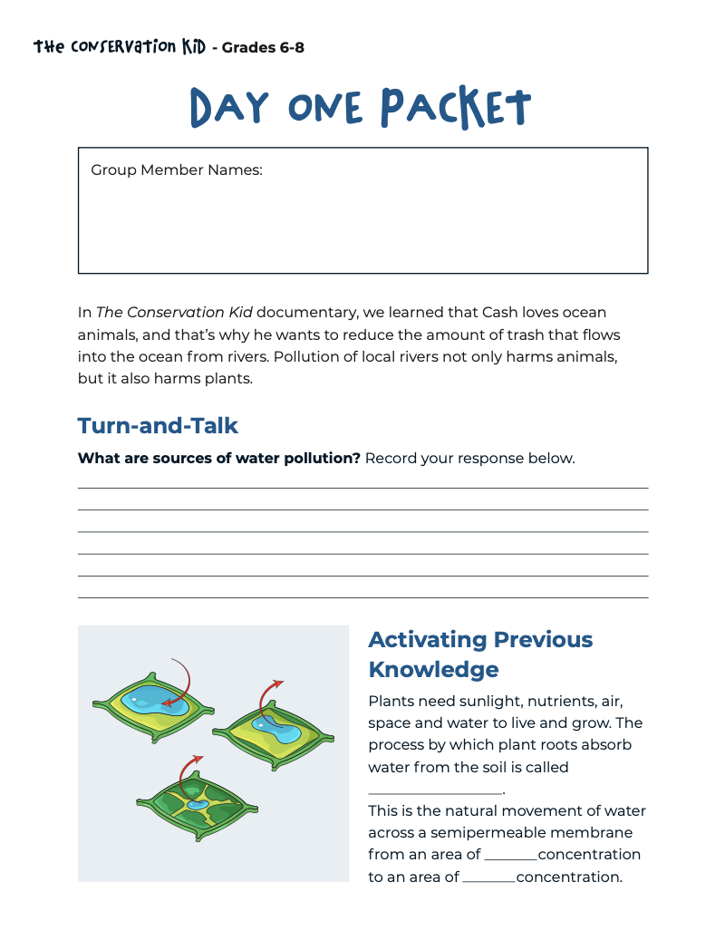 This packet guides teachers through Day One of the Water Pollution and Plants experiment, helping students explore how water quality affects plant growth. It includes instructions and turn-and-talk prompts to support hands-on learning.