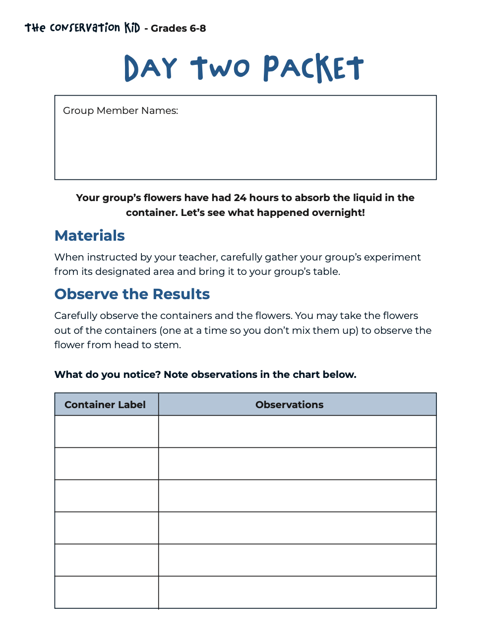 This packet guides teachers through Day Two of the Water Pollution and Plants experiment. Students will observe the results from Day One, analyze their findings, and think critically about how water quality impacts plant growth, with discussion prompts to support reflection.